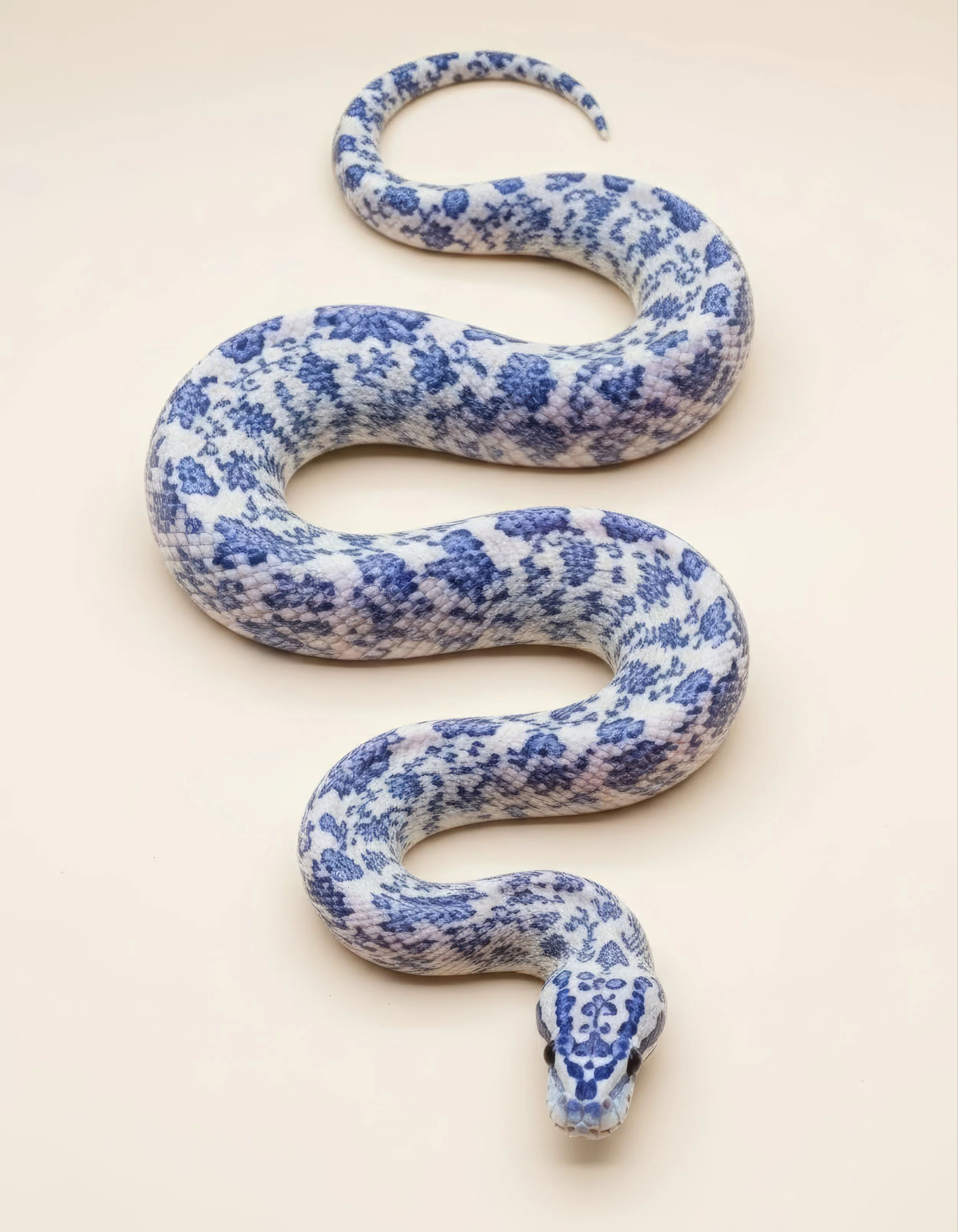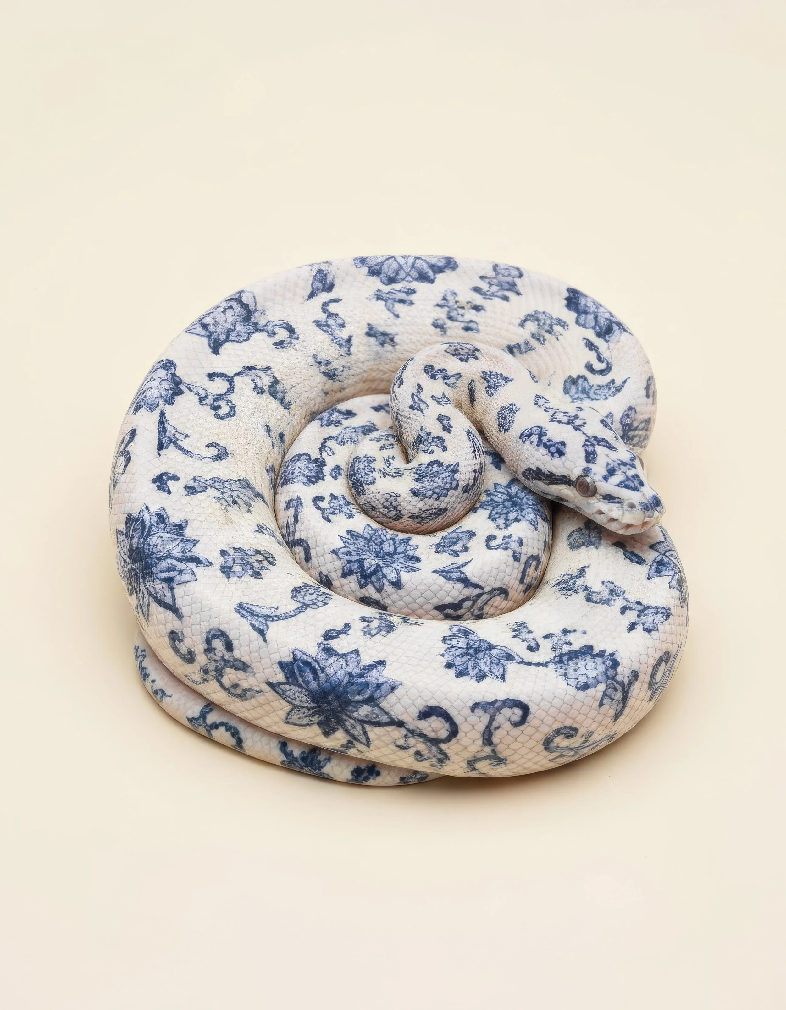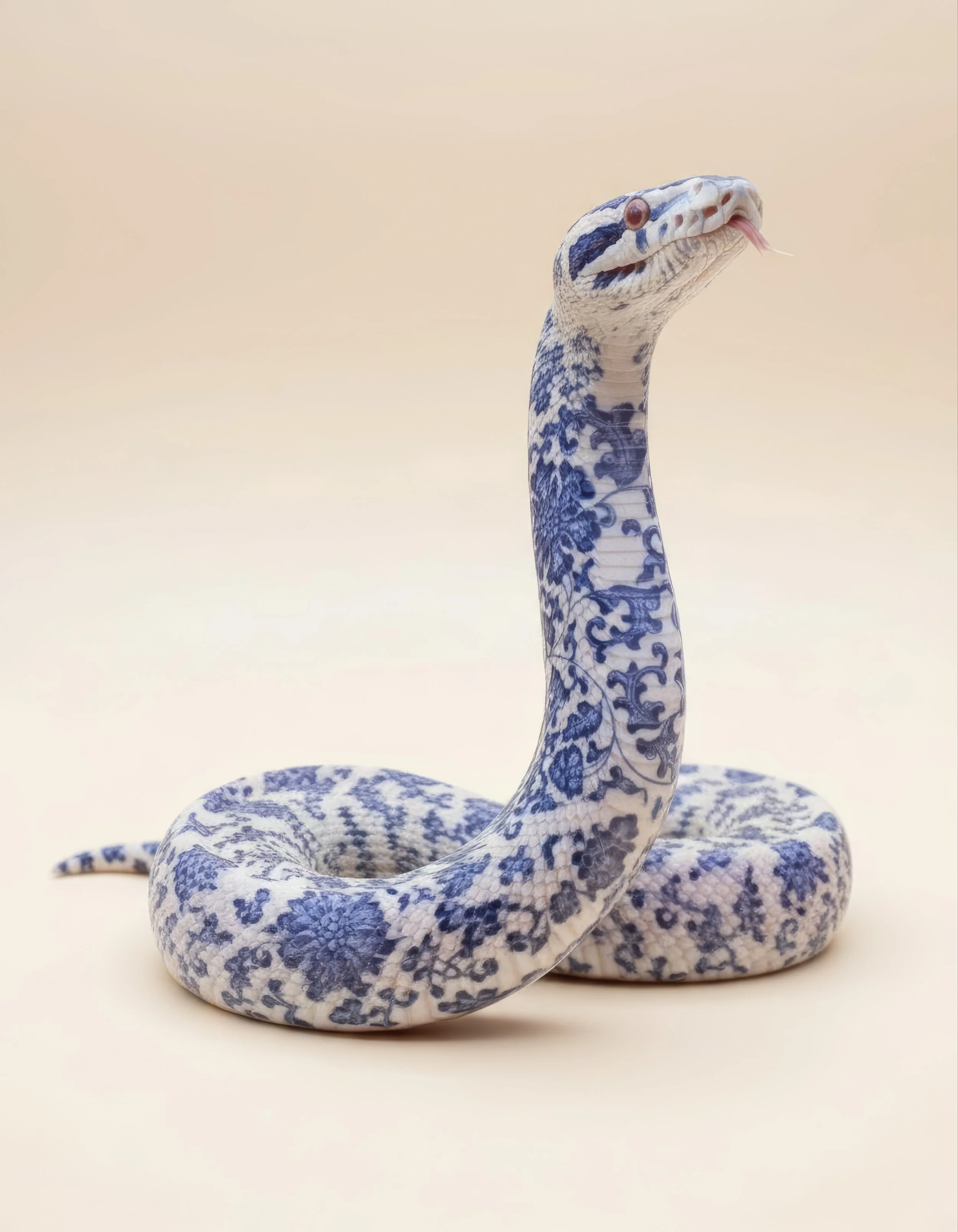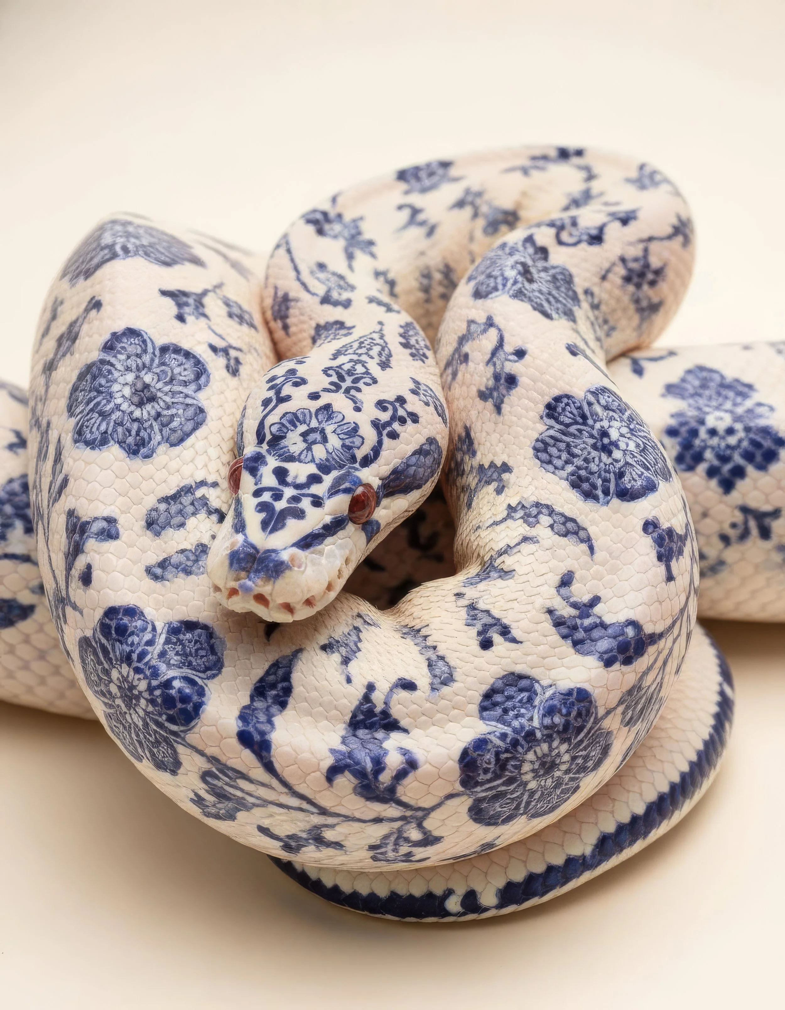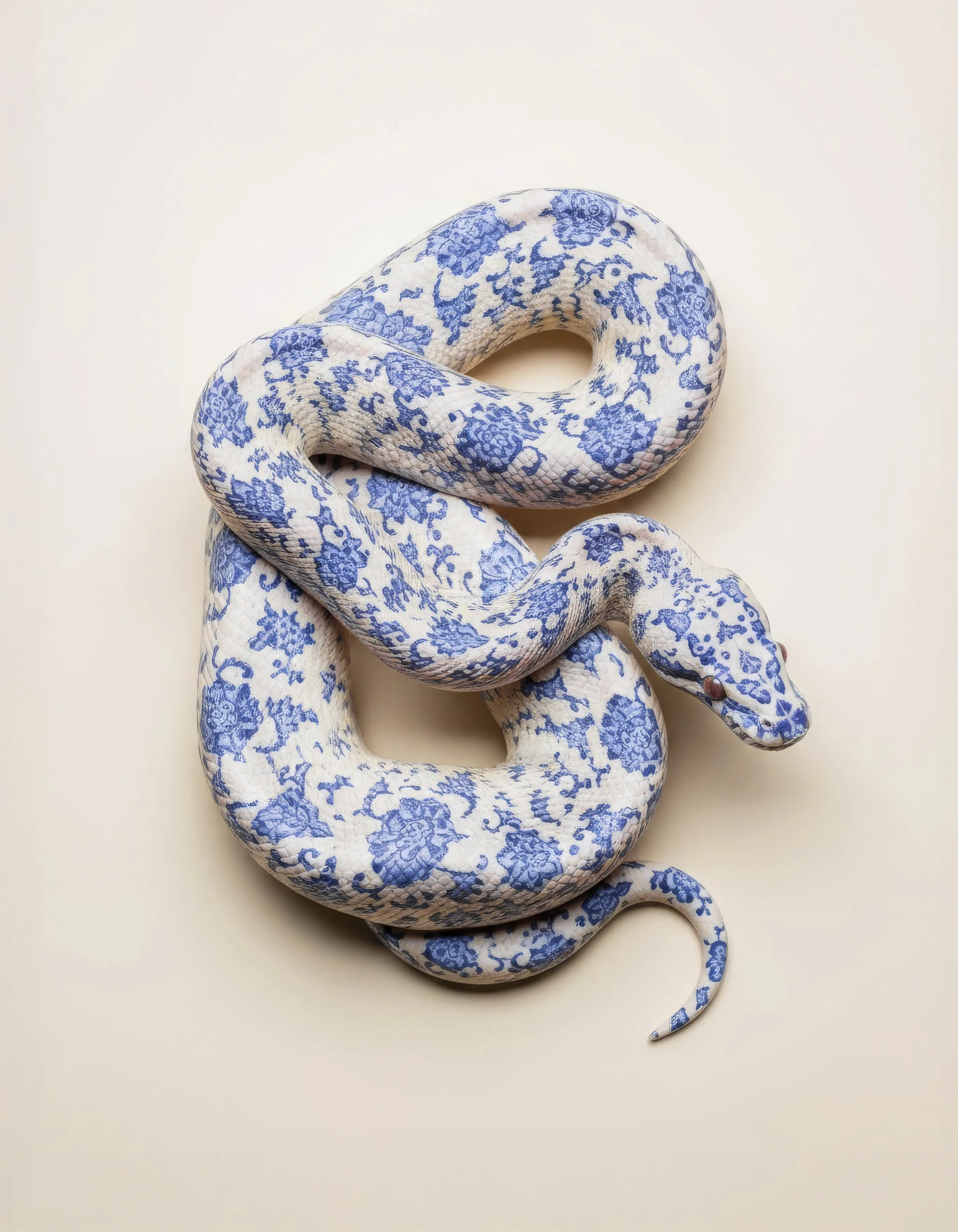 This project explores the collision between danger and delicacy. In the early days of experimenting with AI, I combined unexpected textures with unlikely forms — gemstones with skulls, fur with cars, kintsugi with human skin. But snakes kept returning. This series dresses them in the intricate blue-and-white patterns of fine china, wrapping fragility around something inherently dangerous.