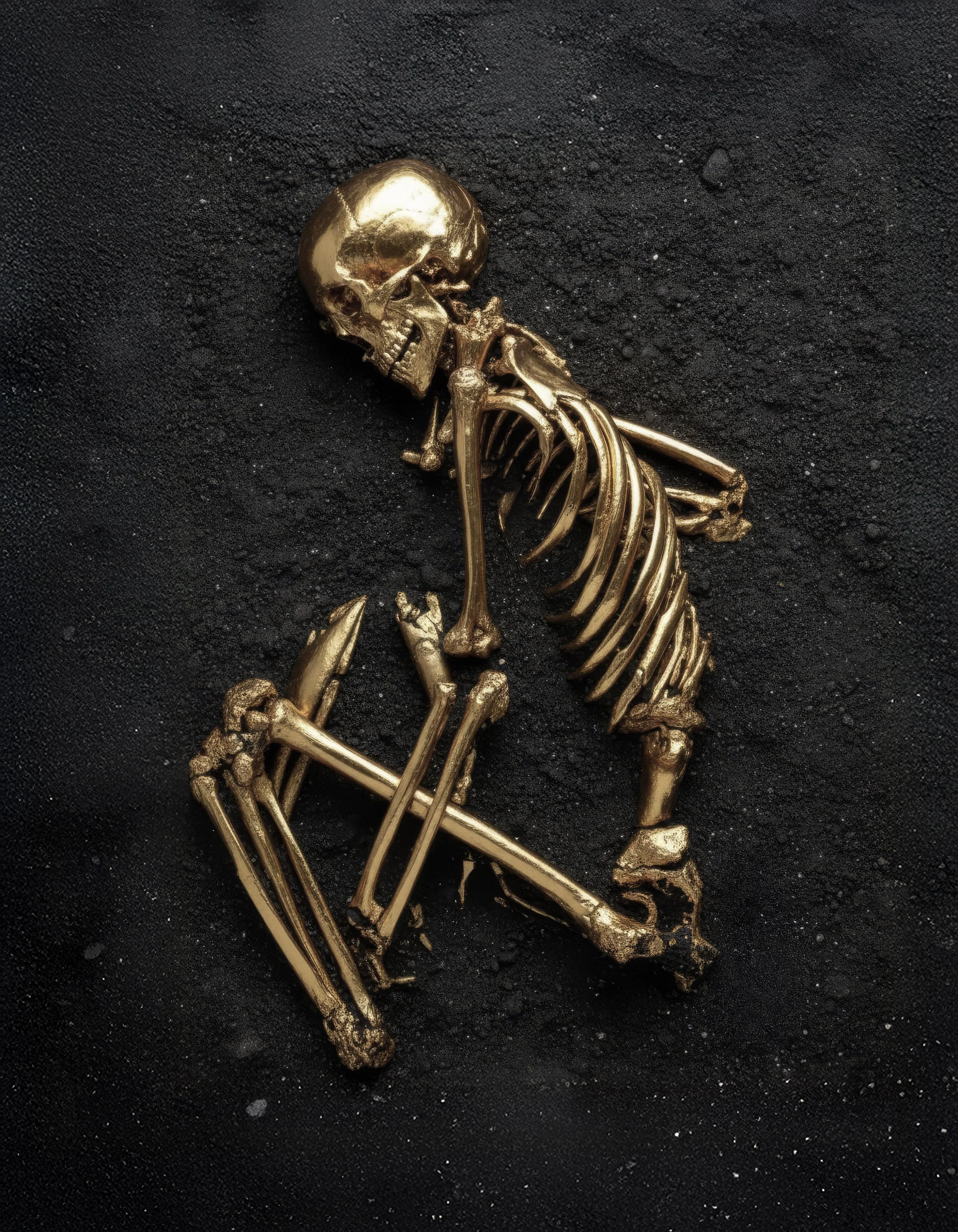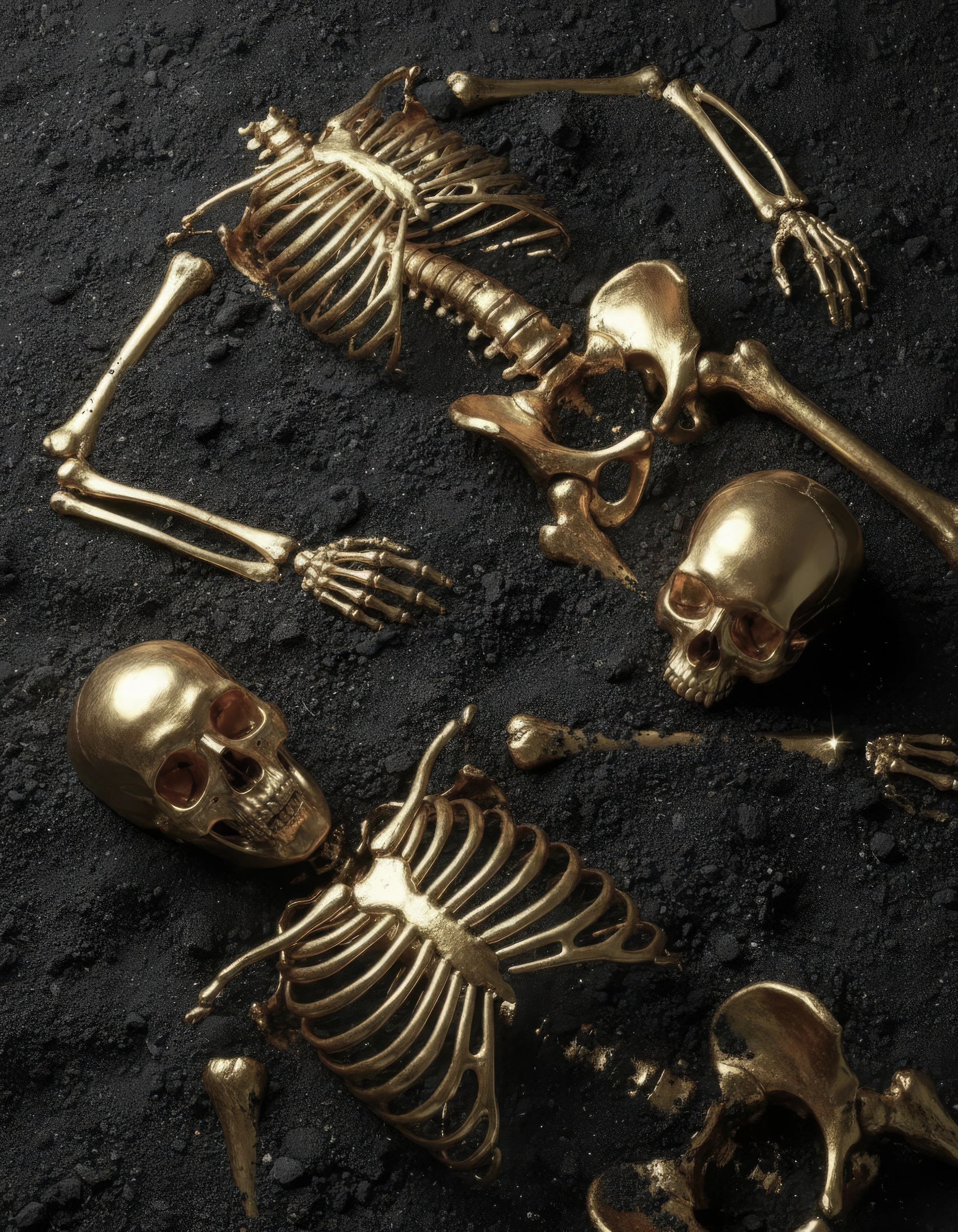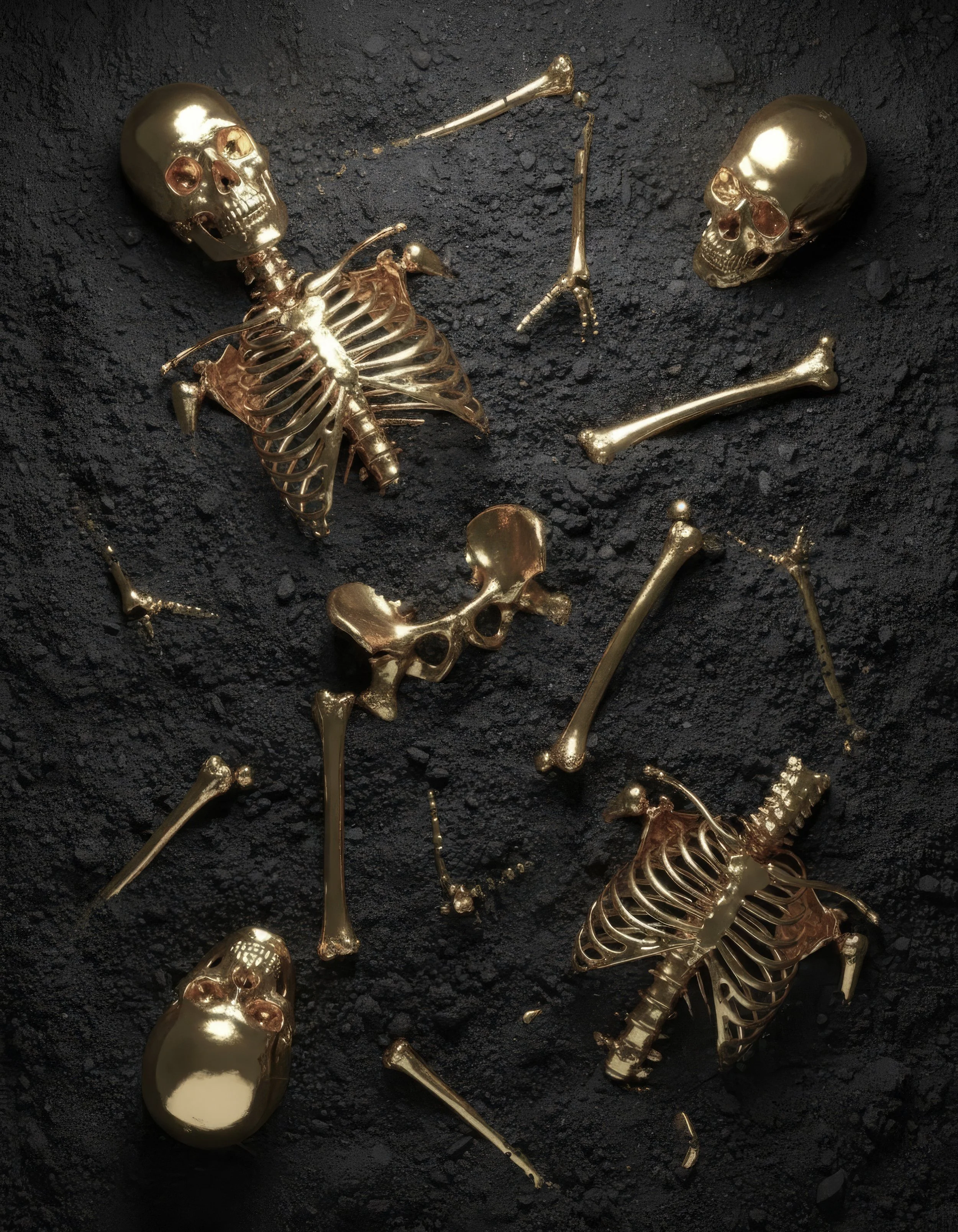 Gilded Remains shows golden skeletons partially uncovered from black earth. The series treats the scene like an archaeological dig — less about treasure, more about the people. It focuses on bonds once lost and now rediscovered